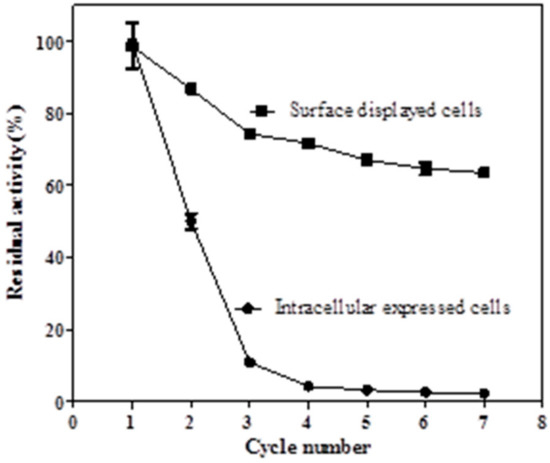 Recyclability of biocatalysts is often a desired feature for the economics of industrial biocatalysis, which may reduce the high costs of biocatalysts in general [34]. However, the toxicity effect of vinylphenol derivatives could cause serious damage to the intracellular decarboxylase-containing cells. Ben-Bassat et al. reported that after a single 4-VP production cycle, the intracellular decarboxylase-containing cells were not viable when streaked on agar plates, which limited cell recycling [9]. The autodisplayed BLPAD showed good recyclability in this study. As shown in Figure 7, the BLPAD displayed cells were successfully recycled for 7 cycles with a residual activity of 63% (The activity at the first run was taken as 100%). In contrast, the recyclability of the intracellular expressing cells was rather low, and their residual activity reduced to approximately 11% after three reuse cycles. This result indicated that BLPAD anchored on the cell surface appeared to be more stable compared to free intracellular enzyme.