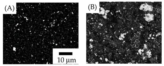 BSE images of Ag over Ag(5.6)-Na(1)/CaCO3 (A) and Ag(56)-Na(1)/CaCO3 (B). The scale of these figures is the same.