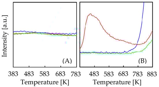 Finally, the acid‒base properties of Ag(56)-Na(1)/CaCO3, Ag(56)-Na(1)/SrCO3, and Ag(56)-Na(1)/MgCO3 were analyzed using NH3- and CO2-TPD, respectively (Figure 6A,B, respectively). As shown in Figure 6A, these three catalysts did not show an acidic nature regardless of supports. For CO2-TPD from Ag(56)-Na(1)/MgCO3, an evident broad peak was detected at approximately 483 K, due to the employment of basic MaCO3 as a support, resulting in the lowest activities among Ag(56)-Na(1)/MCO3 (M = Ca, Sr, and Mg). Furthermore, a desorption peak was evident at temperatures greater than ca. 683 K for Ag(56)-Na(1)/CaCO3 and Ag(56)-Na(1)/SrCO3 or 783 K for Ag(56)-Na(1)/MgCO3. These desorption peaks were due to decarboxylation from the support, indicating that those three catalysts did not show the basic nature that contributed to the present catalysis regardless of supports. Therefore, in the case of a silver catalyst, the particle size may be one of the most important factors for the epoxidation of propylene, while acid base properties may not contribute to the enhancement of catalytic activity. Finally, it is worthwhile to mention that the negligible PO yield of 0.095% on Al‒Ti‒MCM-41 (Si/Ti = 910), followed by a better yield of 0.67% on H-ZSM-5(23.8) was further improved to 2.17% on Ag(56)-Na(1)/SrCO3.