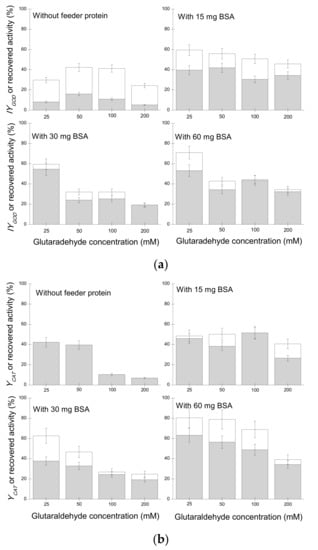 In other instances, glutaraldehyde was slowly added to the suspension to reach the desired final concentrations (25, 50, 100 or 200 mM). After 3 h of reaction with glutaraldehyde at 4 °C under continuous stirring at 200 rpm in a shaker incubator (SL 221, Solab, Piracicaba, SP, Brazil), the suspensions containing combi-CLEAs were centrifuged at 10,000× g for 10 min at 4 °C. Combi-CLEAs were recovered as pellets and washed twice with 2 mL 100 mM sodium phosphate at pH 7.0. Then, the combi-CLEAs were stored in the same buffer (2 mL) at 4 °C for further use. The GOD and CAT activities were calculated as described in Section 3.2, and the immobilization yield (IY) was calculated separately, as follows: