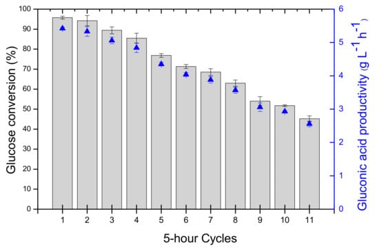 The conversion of glucose to gluconic acid obtained in the first batch was around 96% (Figure 2), with a GA productivity of 5.46 ± 0.04 g L−1 h−1, which is of the same order of magnitude as the highest productivities (5.78–10.89 g L−1 h−1) previously reported for enzymatic bioconversion of glucose to GA using combined GOD/CAT (Table 2).