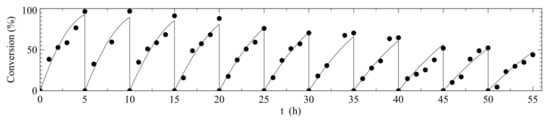 Gluconic acid production from glucose (26 g L−1) in a bubble column reactor kept at 40 °C and pH 6.0. The curves represent the Michaelis-Menten integrated model combined to the first order equation of enzyme inactivation (Equation (5)) fitted to the experimental data of reuse of GOD/CAT combi-CLEA (Km,app = 65.8 ± 18.5 mM and kcat,app = 9.82·± 1.25 × 103 h−1, kd = 0.0204 ± 0.0008 h−1).