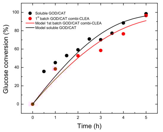 For comparison purposes, the kinetic parameters of soluble GOD were also estimated. The classical Michaelis-Menten model (Equation (3)) was fitted to the experimental data of consumption of glucose versus time catalyzed by a mixture of soluble GOD/CAT (Figure 4) at 40 °C and pH 6.0. The values of the kinetic parameters are presented in Table 3.
