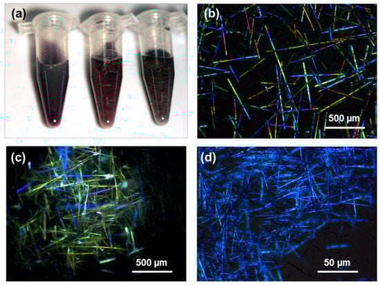 (a) Photograph of salt derivative templates. From left to right Pt2−: Pt2+: Cu2+ ratios are 1:0:1, 2:1:1, and 3:1:2 Magnus’s salt derivatives prepared from 100 mM salt solutions. Polarized optical microscope images of salt needle templates formed from Pt2−:Pt2+:Cu2+ ratios of (b) 1:0:1, (c) 3:1:2, and (d) 2:1:1, 100 mM Magnus’s salt derivatives.