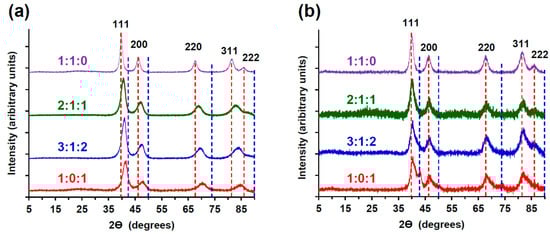 X-ray diffraction spectra of platinum-copper macrotubes-macrobeams reduced with (a) DMAB or (b) NaBH4 from Pt2−: Pt2+:Cu2+ salt ratios of 1:1:0, 2:1:1, 3:1:2, and 1:0:1. Peaks were indexed to JCPDS reference number 01-087-0640 for platinum (red dashed lines), and 03-065-9026 for copper (blue dashed lines).