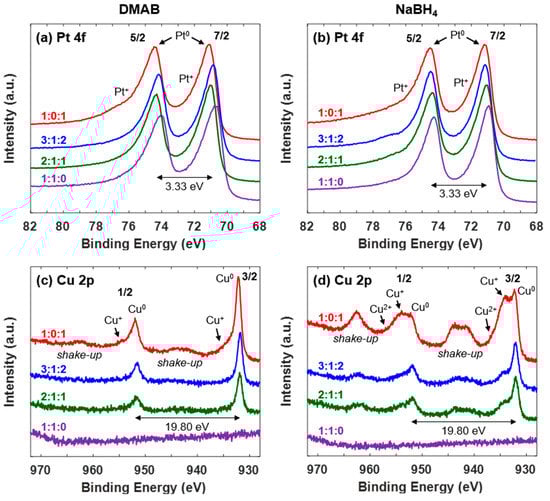 Use of DMAB as a reductant resulted in samples with predominantly metallic Pt and Cu, with traces of Cu2O confined to the 1:0:1 sample. The measured Pt 4f binding energies ranged from 70.7–71.1 eV for the 4f7/2 line and 74.0–74.4 eV for the 4f5/2 line, but did not appear to follow a linear trend with stoichiometric ratio. The DMAB-reduced 1:0:1 sample exhibited Pt+ signatures, which was consistent with the concomitant presence of Cu2O (i.e., Cu+ 2p1/2 and 2p3/2 and shake-ups) in the Cu 2p spectrum. The DMAB-reduced 3:1:2, 2:1:1, and 1:1:0 samples did not exhibit oxidized phases and appeared fully metallic.