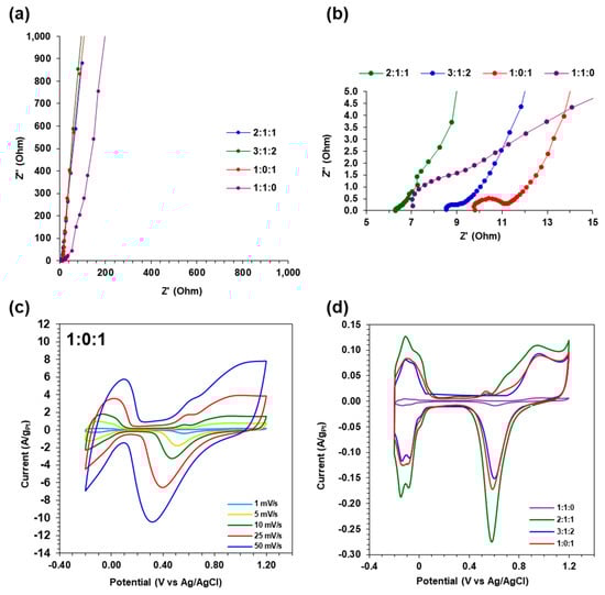 Macrobeams were pressed between glass slides with approximately 200 kPa into free-standing film electrochemical testing. A Bio-Logic VMP-3 potentiostat (Bio-Logic, Knoxville, TN, USA) was used to perform electrochemical impedance spectroscopy (EIS) and cyclic voltammetry (CV). An Ag/AgCl reference electrode, a 1 mm platinum wire counter-electrode, and a lacquer-coated 1 mm platinum wire with exposed tip in contact with samples were used in a three-electrode cell with 0.5 M H2SO4 electrolyte. EIS was performed at open-circuit voltage with a frequency range of 1 MHz to 1 mHz with a 10 mV sine wave. CV was performed in a voltage range of −0.2 to 1.2 V (vs. Ag/AgCl) with scan rates of 0.5, 1, 5, 10, 25, 50, 75, and 100 mV/s. Ethanol oxidation cyclic voltammetry was performed using 1 M KOH and 1 M ethanol with scan rates of 0.5, 1, 5, 10, 25, and 50 mV/s.