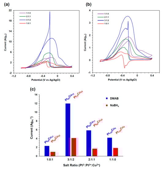 Ethanol oxidation peak currents (AgPt−1) in 1 M KOH and 1 M ethanol at 0.5 mV/s for Pt2−:Pt2+:Cu2+ salt ratios of 1:1:0, 2:1:1, 3:1:2, and 1:0:1 reduced in (a) DMAB and (b) NABH4. (c) Volcano plot from data in (a) and (b) with PtxCuy mass ratios; DMAB (blue) and NABH4 (red).
