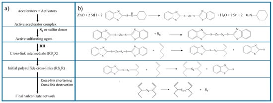 (a) Reaction steps of rubber sulfur vulcanization [27]. Reproduced with permission from Rubber Chemistry and Technology. Copyright© (1984), Rubber Division, American Chemical Society, Inc. (b) Main reactions and intermediates of the vulcanization steps (example in the presence of: ZnO as activator, CBS as accelerator and StH as co-activator).