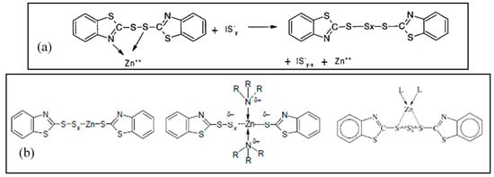 The possible structure of the active sulfurating complex has been suggested to include Zn(II) as a part of the poly-sulfidic chain, with the formation of a covalent bond with sulfur atoms (Figure 3b) [72]. In this case, the possible coordination of zinc with other ligands as amino (released from accelerators as sulphenamides) or carboxylate groups (e.g., from StH) could potentially be able to increase the stability of the zinc complex (Figure 3b). However, a more probable structure has been proposed, suggesting a coordinative bond between the polysulphide chain and the Zn(II) center, which is stabilized by the presence of additional ligands generated in situ [50] (Figure 3b).