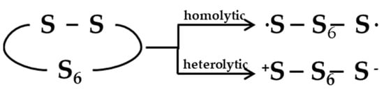 A significant debate is reported in the literature as concerns the occurrence of a radical or ionic vulcanization mechanism. In unaccelerated reactions, sulfur may undergo both homolytic (radical) or heterolytic (polar/ionic) reactions of S8 ring opening (Figure 4) [23]. The same is likely to happen in accelerated reactions, but different studies were published in the attempt to clarify whether radical or ionic species are involved in the mechanism.