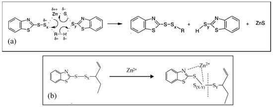 In the following steps, the Zn(II) centers are supposed to interact with the accelerator and sulfur, to give rise to the so-called active accelerator complex and active sulfurating species, respectively [72]. Figure 3a reports an example of a Zn-accelerator complex that is generated between Zn2+ ions and MTBS proposed by Coran et al. [79]. Zinc behaves as a Lewis acid and facilitates the insertion of sulfur in the active accelerator complex favoring the S-C bond opening, and thus the formation of active sulfurating agents. Morgan et al. [80] confirmed that ZnO favors the opening of the sulfur rings, increasing the sulfur availability.