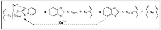 After the formation of the cross-linked products, this sequence can be repeated more than once on the sulfurating complex, progressively shortening the sulfur chains and giving rise to the final rubber network. Also, in this case, zinc ions are supposed to support the shortening process [86]. Zn(II) centers were also proposed [40] to break-down the already formed polysulfide cross-links.