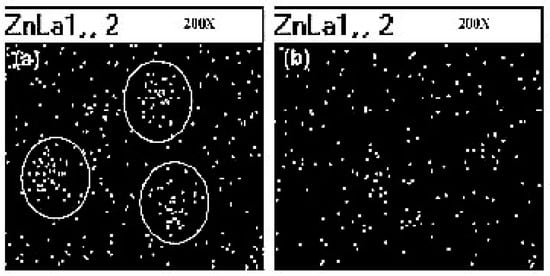 Scanning Electron Microscopy (SEM)/X-ray dot mapping of (a) natural rubber (NR) vulcanized with conventional rubber grade ZnO, (b) NR vulcanized with ZnO nanoparticle showing dispersion of Zn(x200). Reprinted from [89], Copyright (2007), with permission from Wiley Periodicals, Inc.