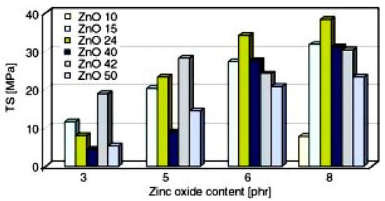 Tensile strength of nitrile rubber vulcanizates, containing ZnO NPs with different specific surface areas and shapes: ZnO 10, 10.0 m2/g—spheres and rods; ZnO 15, 15.2 m2/g—whiskers; ZnO 24, 24.4 m2/g—snowflakes; ZnO 40, 40.8 m2/g—spheres; ZnO 42, 42.5 m2/g—spheres; ZnO 50, 50.0 m2/g—spheres. Reprinted from [90], Copyright (2009), with permission from Express Polymer Letters.
