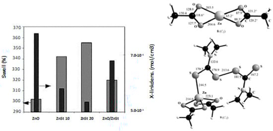 (a) Swelling and cross-linking density of s-SBR compounds with zinc stearate (moving from the left to the right: zinc oxide 3 phr, zinc stearate (ZnSt2) 10 and 20 phr respectively and zinc oxide/zinc stearate 0.5/6.1 phr). Reprinted from [97], Copyright (2006), with permission from Wiley-VCH, Inc. (b) Structure of zinc acetate complex and of Zn(OOCMe)2(TMTD) calculated; Reprinted from [98], Copyright (2008), with permission from Wiley-VCH, Inc.