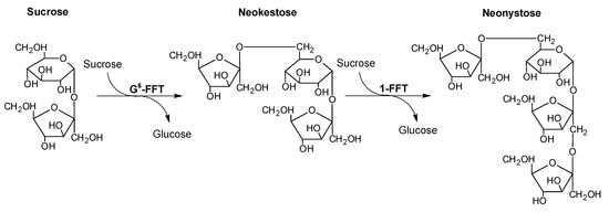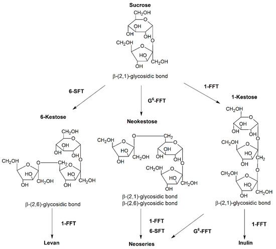 FOS are classified according to the type of glycosidic bond between the glucose unit and the adjacent fructose or between subsequent fructose residues (Figure 1). If β(2,1) glycosidic bonds are present they are classified as linear inulins, if β(2,6) glycosidic bonds are present they are linear levans, and if both β(2,6) and β(2,1) glycosidic bonds are present along with β(2,1) glycosidic extensions, they are assigned to the neoseries (neoFOS). The latter is characterized by greater thermal and chemical stability than commercially available inulins [16]. Furthermore, neokestose is the primary FOS utilized by bifidobacteria [10], which promote health by stimulating the immune system, promoting the regeneration of the intestinal flora after antibiotic therapy [17] and inhibiting bacterial pathogens by secreting growth-inhibiting substances and acids [18].