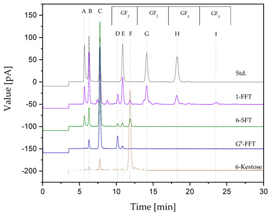 Chromatograms showing FOS standards and catalytic products. Offset = 50 pA between chromatograms. The peaks correspond to (A) fructose, (B) glucose, (C) sucrose, (D) neokestose, (E) 1-kestose, (F) 6-kestose, (G) nystose, (H) 1F-fructofranosylnystose, and (I) a putative FOS with five fructose molecules (GF5). The chromatograms represent a standard solution (Std.), the catalysis products of 1-FFT, 6-SFT and G6-FFT and a 6-kestose sample.