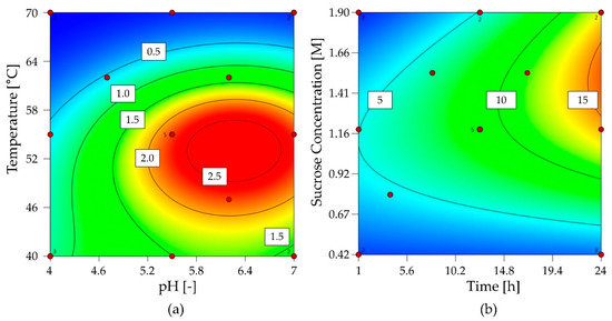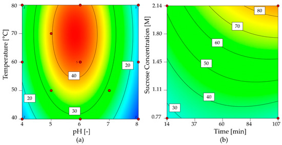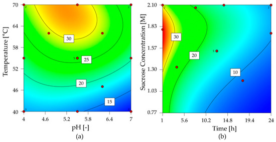 The extracellular 6-SFT secreted by K. lactis has a dominant hydrolase activity, which is undesirable in a neoFOS production system because it favors the recovery of levan-type byproducts. We therefore characterized the enzyme as above in order to find conditions that limited its activity, using total activity [U mL−1] as the response and experimental ranges based on previous studies of fungal invertases and fructosyltransferases [38,39,40,41]. We selected the pH range 4–7 and the temperature range 40–70 °C (Figure 6a). As before, an equivalent design was used to study the effect of sucrose concentration (0.77–2.10 M) and reaction times of 1–24 h (Figure 6b).