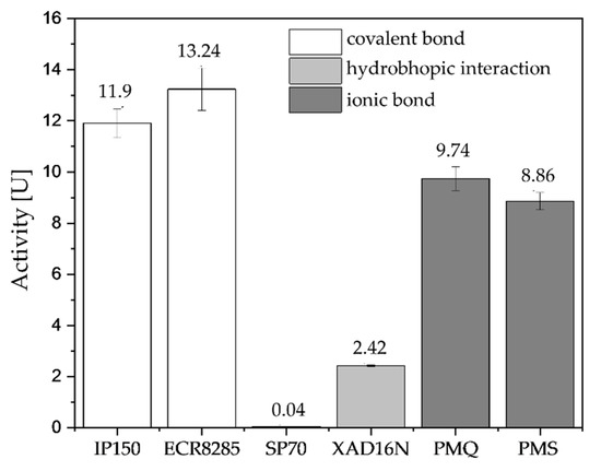 Having determined optimal reaction conditions favoring the activity of 1-FFT over 6-SFT, we next sought an appropriate carrier for enzyme immobilization in order to establish a two-step reaction process. We used 1-FFT as a model to screen different carriers because this enzyme is intrinsically more active than G6-FFT. For covalent immobilization, we used Immobead 150P polymethacrylate porous beads with epoxy functions (IP150), which were previously used to immobilize an acid phosphatase [49]. We also used the novel epoxy resin ECR8285 with a hydrophobic butyl methacrylate base, which has previously been used to immobilize a lipase [50]. For noncovalent ionic interactions, we used Mustang Q (PMQ) strong anion exchange membranes featuring quaternary amine ligands, which have been used for enzyme immobilization in earlier studies [34,51], as well as Mustang S (PMS) strong cation exchange membranes. Both membranes featured a hydrophobic polyethersulfone base. The treated carriers described above were compared to hydrophobic Sepabeads SP70 (Mitsubishi Chemical Corporation, Tokyo, Japan) and Amberlite XAD16N (DuPont de Nemours, Wilmington, USA) carriers, which have been used for the adsorption of amino acids and naringin [52,53].