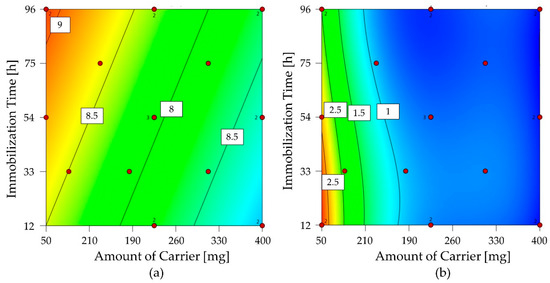 Contour plot for the optimization of immobilization based on the transfer activity [U] of (a) the carrier and (b) the supernatant.