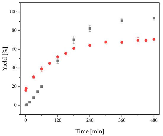 Time course of FOS relative yield by immobilized 1-FFT (black, 5 g loaded carrier) and 1-FFT crude enzyme solution (red, 10% (v/v)).