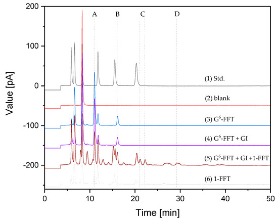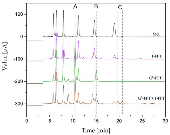 G6-FFT achieved the highest specificity for the neoseries. Given that the composition of the reaction solution in the first and the second steps differed mainly in the neoFOS concentration, the enlarged peak was assigned to the neoseries. Following the elution profile of FOS with different degrees of polymerization, this peak corresponds to a putative GF5 neoFOS species (Figure 11).