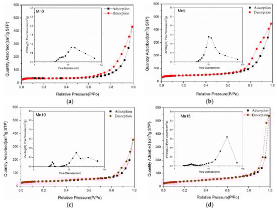 N2 adsorption/desorption isotherms of Mn-doped MgAlOx mixed oxides. (a) Mn0; (b) Mn5; (c) Mn10; (d) Mn15; (e) Mn20.