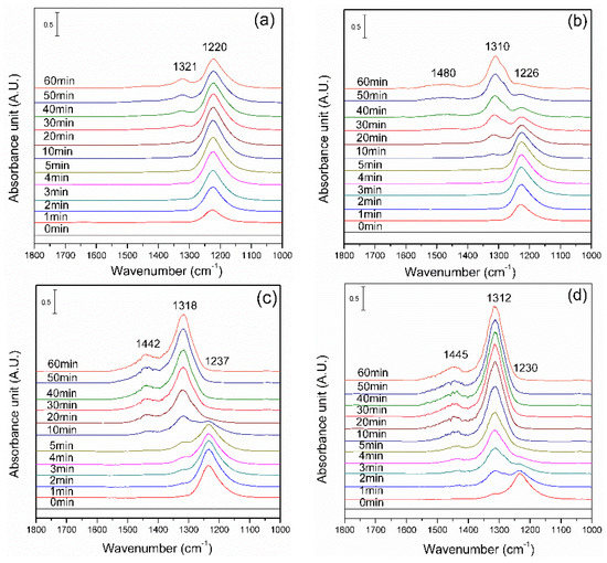 Figure 9 shows the in situ DRIFTS spectra of Mn15 sample after exposure to NO + O2 at different temperatures for 60 min. The specific species are summarized in Table 7. At 150 °C, the broad peak located at 1220 cm−1 was assigned to bridged bidentate nitrite, corresponding to the adsorption of NO on the weak basic sites [32,51]. The weak peak at 1321 cm−1 was associated with bridged bidentate nitrate. For adsorption at 200 °C, the peaks at 1226 cm−1 assigned to bridged bidentate nitrite appeared in the initial stage and later shifted to 1310 cm−1 and 1480 cm−1 that ascribed to bridged bidentate nitrate and monodentate nitrate, indicating a conversion from nitrite to nitrate on the sample. The species formed at 250 °C and 300 °C were similar to that at 200 °C. Differently, the rate of nitrite oxidation was improved with increasing adsorption temperature, indicating high adsorption temperatures accelerated the transformation of nitrites to nitrates. Besides, the peak intensity of nitrate species increased, suggesting high temperatures were favorable to form more stable nitrates species. For adsorption at 350 °C, only bridged bidentate nitrate (1315 cm−1) and monodentate nitrate (1438 cm−1) were formed and became the major species in the final period, implying the storage of NO on the sample followed the “nitrate” pathway. Besides, their intensities increased with an increment in adsorption time. It is concluded that, within 10 min of adsorption, the NOx adsorbed species on Mn15 catalyst were mainly various nitrites at lower temperatures (<300 °C), while NOx was mainly stored in the form of nitrate at higher temperatures (≥300 °C). Therefore, Mn-doped hydrotalcite catalysts are preferred for low temperature NOx storage and release may because they can store NOx as thermally labile nitrites.