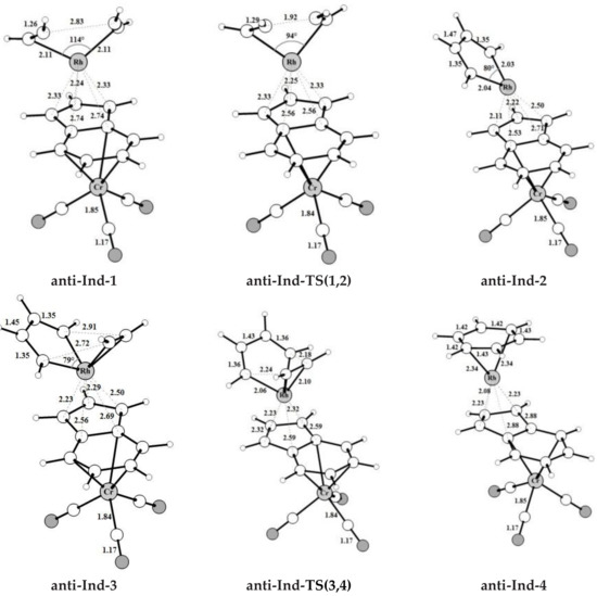 Inspired by the experimental work by Ceccon et al. [33,34,35], we chose the bimetallic catalyst [Cr(CO)3 IndRhL2], where the second metal group Cr(CO)3 can be coordinated both in anti and syn conformations and examined both paths I and II of Scheme 3. The optimized molecular structures (ZORA-BLYP/TZ2P) of anti- and syn-[Cr(CO)3IndRh(CO)2] (Figure S1) are in good agreement with the X-ray crystallographic structures (labelled as HEXPOP [50] and HAPPOD [34] in the Cambridge database (CSD) [51]). Significant geometry parameters are compared in Table S1.