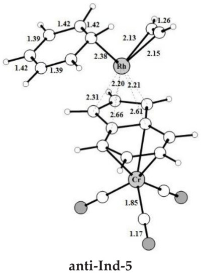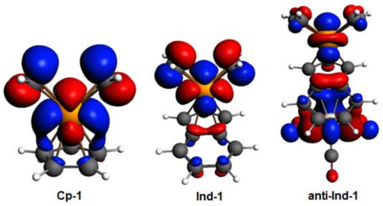 By inspecting the frontier molecular orbitals of Cp-1, Ind-1 and anti-Ind-1 shown in Figure 3, the π-antibonding character between Cp’-π system and valence d orbitals of Rh is found to increase in the order Cp-1 < Ind-1 < anti-Ind-1, leading to a corresponding increase of metal slippage. Calhorda et al. have reported the same observation in their pioneering work on the nature of indenyl effect, which was related to the nodal characteristics of Cp’-π orbitals of CpRh and IndRh [19,44]. Herein, it is found that the metal-π anti-bonding nature with Ind-π system is further enhanced in the presence of Cr(CO)3 in anti-Ind-1 compared to the parent Ind-1, leading to extra slippage of rhodium in the former.