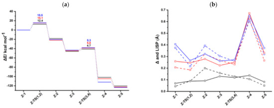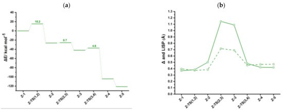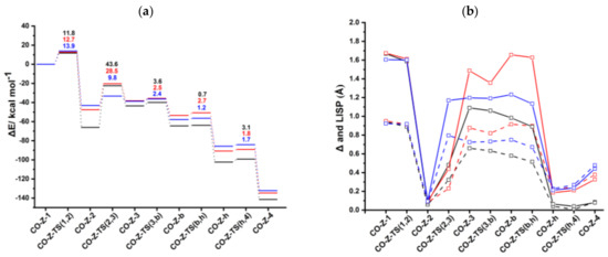 Conversely, along the catalytic Path II (Scheme 3b), in terms of , a significant enhancement of the catalytic activity of the bimetallic anti-IndRh(CO) is found compared to those of the parent catalysts IndRh(CO) and CpRh(CO). On the basis of the values reported in Table 7, the following trend can be established anti-IndRh(CO) > IndRh(CO) > CpRh(CO), which is consistent with the experimental observation [26]. In this case, the intermediate CO-Z-2 is the TDI and the subsequent transition state CO-Z-TS (2,3) is the TDTS (Figure 6a). We can thus confirm that the coordination of Cr(CO)3 favors the catalytic activity.