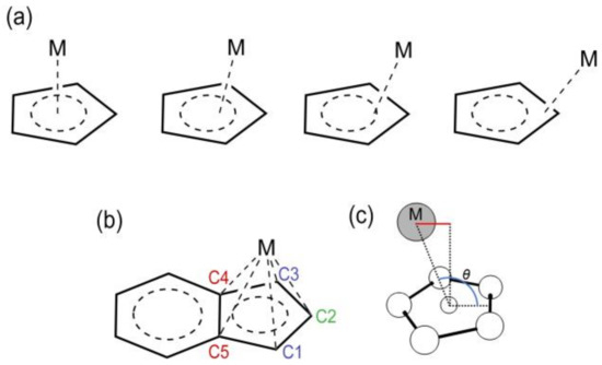 (a) Different coordination modes (hapticities) of a metal (M) to a Cp ring. (b) Labelling scheme used in the definition of Δ and LISP (Equations (1) and (2)). (c). Definition of θ angle for LISP calculation.