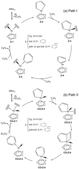 Mechanism of acetylene [2+2+2] cycloaddition to benzene catalyzed by ZRh (Z = Cp, Ind and anti or syn-Ind) (Path I) (a) and by CO-ZRh fragments (Z = Cp, Ind and anti-Ind; L = CO) (Path II) (b).