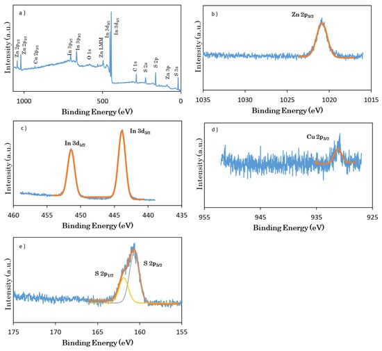 X-ray photoelectron spectroscopy (XPS) narrow and survey spectra of Zn0.74Cu0.13In2S3.805. (a) survey, (b) Zn, (c) In, (d) Cu and (e) S.