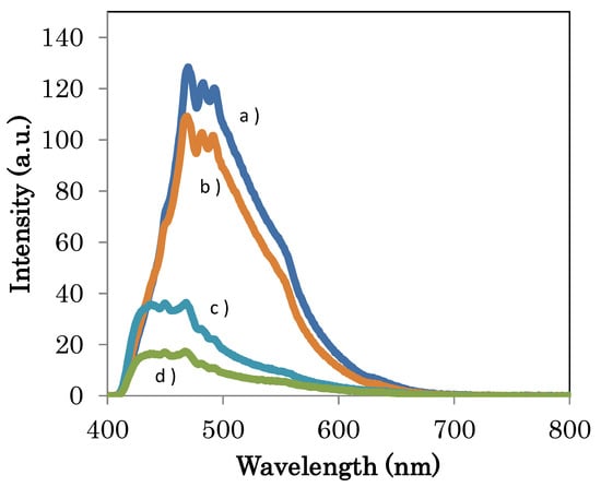Photoluminescence spectra for (a) ZnIn2S4, (b) Zn0.87In2S3.87, (c) Zn0.87Cu0.13In2S3.935 and (d) Zn0.74Cu0.13In2S3.805. Excitation: 350 nm.