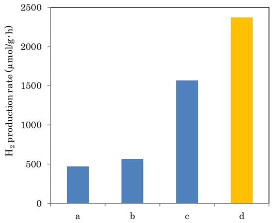 Photocatalytic hydrogen production rate with (a) ZnIn2S4, (b) Zn0.87In2S3.87, (c) Zn0.87Cu0.13In2S3.935 and (d) Zn0.74Cu0.13In2S3.805.