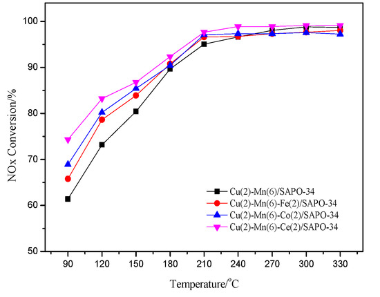 Figure 2 illustrates the changes of Cu–Mn/SAPO-34 catalyst activity after adding transition metals. It can be seen from Figure 2 that the Cu–Mn/SAPO-34 exhibits superior low-temperature SCR activity, which is up to 79% and 88% at 150 °C and 180 °C, respectively. The addition of transition metals has a significant promoting effect on the low-temperature SCR activity of the Cu–Mn/SAPO-34 catalyst, especially by the addition of Ce and Co. However, with the increase of reaction temperature to 270 °C, the activity of partially modified catalysts is lower than the Cu–Mn/SAPO-34 catalyst. Moreover, the activity of the Co- and Fe-modified Cu–Mn/SAPO-34 catalysts are decreased compared with that at 240 °C. This result demonstrates that the addition of transition metals enhance the oxidation ability of the catalyst, causing the catalytic oxidation of NH3 to NO (i.e., C–O reaction) at higher temperatures [23,24]. Among all three transition metals, the Ce-modified Cu–Mn/SAPO-34 exhibits the highest SCR activity in the wide temperature range between 90 °C and 330 °C.