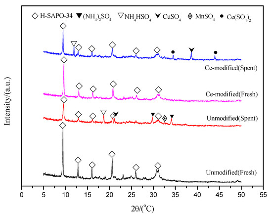 Figure 6 Shows the XRD spectra of Cu–Mn/SAPO-34 and Ce-modified Cu–Mn/SAPO-34 catalysts before and after SO2 poisoning. After the SO2 poisoning process, several new diffraction peaks were observed at 11.93°, 21.08°, 31.46°, and 33.11° for Cu–Mn/SAPO-34 catalyst, and the anterior two peaks were due to the formation of NH4HSO4(PDF#25-0034), CuSO4(PDF28-0401), and the latter two were assigned to (NH4)2SO4(PDF#40-0660) and MnSO4(PDF35-0751). With the introduction of Ce to the Cu–Mn/SAPO-34 catalyst, the peak attributed to Ce(SO4)2 appeared, while no peak ascribed to MnSO4 and (NH4)2SO4 was observed. It is possible that the addition of Ce reduces the accumulation of ammonium sulfate on the surface of the catalyst, and the sulfation of Ce effectively protects the active component Mn from being sulfated, resulting in a significant increase in the resistance to SO2 with the addition of Ce promoter.