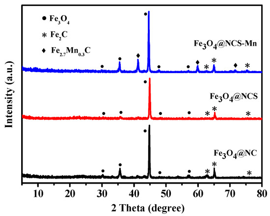 XRD patterns of Fe3O4@NC, Fe3O4@NCS, and Fe3O4@NCS-Mn catalysts.