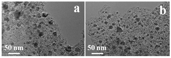 Typical TEM morphology of (a) Fe3O4@NC and (b) Fe3O4@NCS-Mn catalysts.