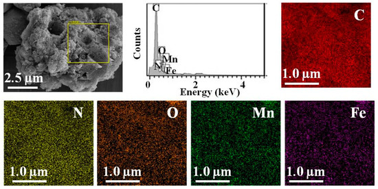 SEM image of Fe3O4@NCS-Mn and corresponding EDS elemental mapping images of C, N, O, Mn, and Fe based on the selected region.