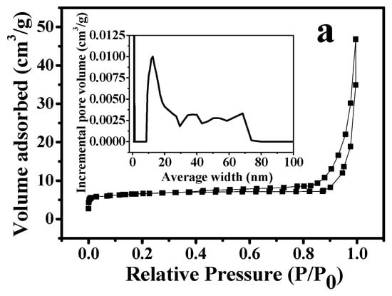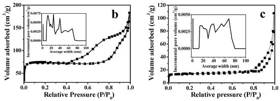 The specific surface areas and pore size distributions were investigated using N2 adsorption/desorption experiments for the three samples. As depicted in Figure 4, the samples exhibit type-II isotherms with H4 hysteresis loop. This indicated the coexistence of slit-like pores as well as irregular mesoporous structure. The Brunauer-Emmett-Teller (BET) surface area/pore volume were 87/0.11, 214/0.28, and 143/0.17 m2·g−1/cm3·g−1 for Fe3O4@NC, Fe3O4@NCS, and Fe3O4@NCS-Mn, respectively (Table 1). Furthermore, all samples were dominated by the mesopores, which account for higher than 80% of BET surface areas and 71% for the samples’ pore volumes (Table 1).