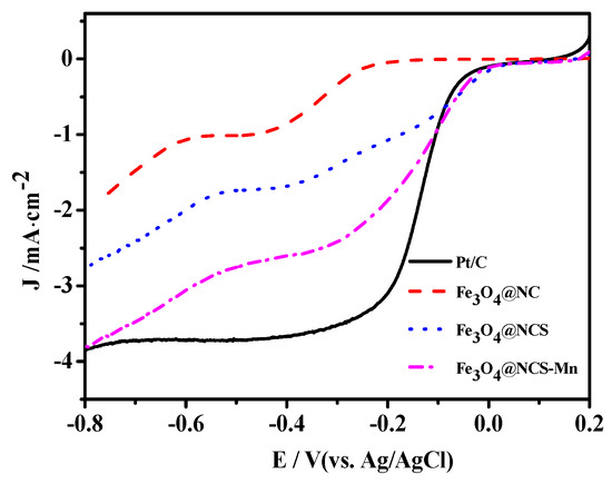 The catalytic activities of the as-prepared catalysts for ORR were tested in O2 saturated 0.1 M KOH. The commercial Pt/C (20 wt%) was used as a control catalyst. The linear sweep voltammetry (LSV) plots of different catalysts for ORR are displayed in Figure 5 and the characteristic parameters for ORR activity evaluation are listed in Table 2. As can be seen, the Fe3O4@NCS-Mn catalyst showed the highest onset potential and limiting current density of −0.02 V (vs. AgCl) and 3.8 mA/cm2, which is almost the same with the corresponding ones of commercial Pt/C (20%). The catalyst also exhibited the most positive half-wave potential of −0.205 V (vs. AgCl), which is only 66 mV more negative than that of Pt/C (20%). The results confirm that the addition of Mn can enhance the catalytic activity.