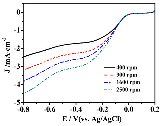 Polarization curves of Fe3O4@NCS-Mn catalyst at different rotation speeds. Scan rate: 10 mV·s−1.