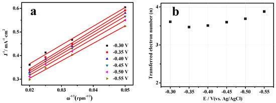 The kinetics of ORR that employed Fe3O4@NCS-Mn as a catalyst were further investigated. The LSV curves at different rotation speeds are shown in Figure 6. As can be seen, the limiting current density increased with the increase in the rotating speeds due to the enhanced oxygen flux to the electrode surface [38]. Figure 7a shows the plots of j−1 versus ω−1/2 at different potentials in the range of −0.3~−0.55 V. A great linear correlation between j−1 and ω−1/2 confirms that the reaction is first-order with regard to the concentration of dissolved oxygen. Based on the Koutecky-Levich (K-L) equation, Figure 7b presents the transferred electron number (n) in ORR under different potentials. The average n was found to be 3.6 in the potential range of −0.30 V to −0.60 V, which indicates an approximate 4e− ORR process. This is considered to be the most efficient ORR pathway.