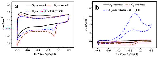 CV curves of (a) Fe3O4@NCS-Mn and (b) Pt/C (20%) in N2 or O2-saturated 0.1 M KOH as well as O2-saturated 0.1 M KOH with 3 M CH3OH. Scan rate: 10 mV·s−1.