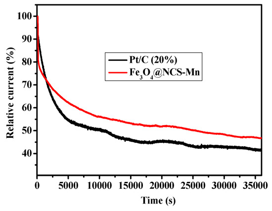 The traditional ORR catalysts have been challenged in their stabilities, which is another important feature for ORR catalyst with great quality. The relative current was measured for both Fe3O4@NCS-Mn and commercial Pt/C (20%) at −0.3 V (vs. Ag/AgCl) in an O2 saturated 0.1 M KOH solution. Figure 9 indicates that the relative current of Fe3O4@NCS-Mn shows a decay of 53.2%, whereas the Pt/C (20%) catalyst exhibits a decay of 58.5% after a 36,000 s chronoamperometric test. Therefore, Fe3O4@NCS-Mn is more stable than the Pt/C (20%) catalyst in the alkaline medium.