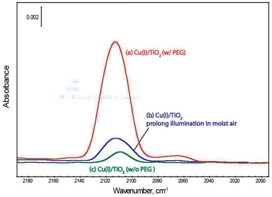 Photocatalysts synthesis predominately involves organic materials as reaction reagents. The residues of such organic materials are not easily removed, even with calcination at higher temperatures. Photocatalytic CO2 reduction products mainly hydrocarbons, using such catalysts, originate concomitantly from these organic residues and CO2 as well [,,]. Thus, yields from such photocatalysts are overestimated when compared to the actual yield originating from photocatalytic CO2 reduction. However, isotopic labelling by 13CO2 is carried out to rule out the possible involvement of these organics in overall photocatalytic yield. To understand the effects of organic contamination, Yang et al. performed Fourier Transform Infrared Spectroscopy (FTIR) investigations for photocatalytic CO2 reduction over Cu(I)/TiO2 photocatalyst synthesized by two different ways: one with polyethylene glycol (PEG) and another without PEG. The FTIR results showed that Cu(I)/TiO2 with PEG produces more CO (photocatalytic reduction product) as compared to Cu(I)/TiO2 without PEG as shown in Figure 1. This CO originates from organic contaminants even without the introduction of CO2. The possible mechanism of formation of CO is represented by Equations (1) and (2),