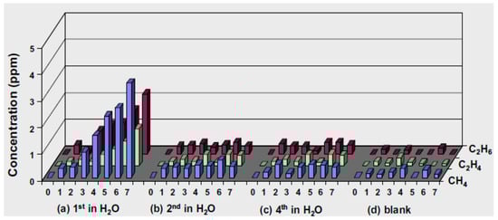 (a–c) production of CH4, C2H6, and C2H4 over Ti-SBA-15 for four cycles, and (d) blank test (without catalyst). After every cycle reactor was evacuated with He/H2O, reproduced with permission from reference []. Copyright Elsevier, 2011.